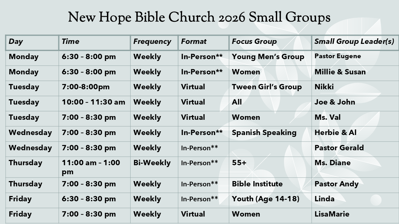 Small groups are a great way to connect with others on a smaller scale and dive deeper into God's Word. It helps us to be in community and to grow with one another! Throughout the year, we will have five small group cycles (both in person and virtual available) with breaks in between. Here is a list of the current small groups that are available. We would love for you to join us!